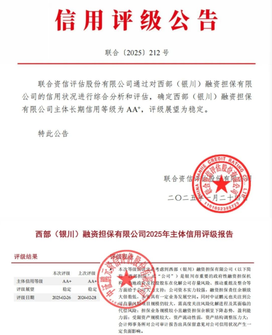 近期,西部擔(dān)保先后經(jīng)國內(nèi)權(quán)威評級機(jī)構(gòu)聯(lián)合資信評估股份有限公司、中證鵬元資信評估股份有限公司評定,2025年度主體信用跟蹤評級結(jié)果均為AA+,評級展望穩(wěn)定。