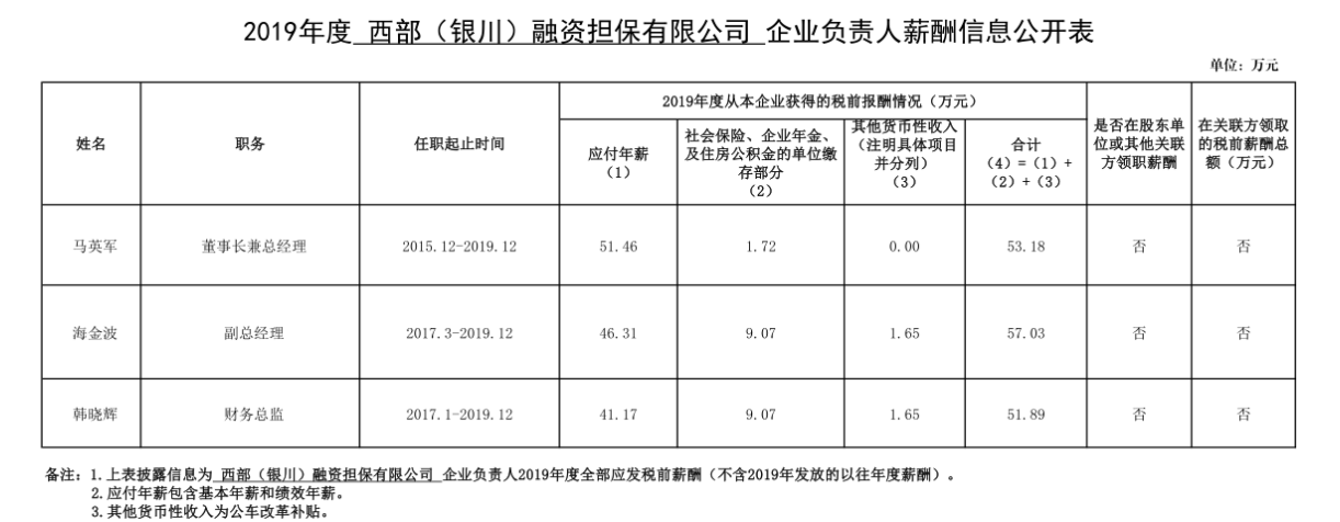根據(jù)銀川市國(guó)資委《關(guān)于做好2019-2020年度企業(yè)負(fù)責(zé)人薪酬信息公開(kāi)的通知》規(guī)定,經(jīng)審核,現(xiàn)將西部(銀川)融資擔(dān)保有限公司企業(yè)負(fù)責(zé)人2019年度薪酬信息予以公開(kāi)。